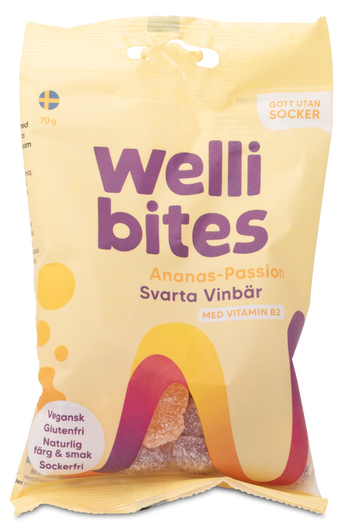 Wellibites Ananas-Passion & Mustaherukka on sokeriton ja vegaaninen karkkigeeli. Maku ja väri tulevat luonnostaan hedelmistä ja vihanneksista. Vastustamattoman herkullista ja täynnä makua sekä 40 % vähemmän kaloreita kuin tavallisissa karkissa. Maku yhdistää trooppista ananasta ja passionhedelmää sekä mustaherukkaa, ja lisäksi se on rikastettu B2-vitamiinilla. Gluteeniton ja palmuöljytön. Nauti terveellisestä ja herkullisesta karkista!