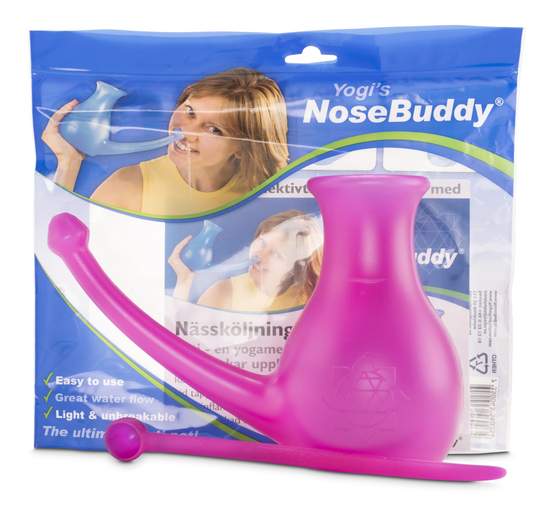 Yogis NoseBuddy auttaa pitämään nenän puhtaana ja helpottaa hengittämistä jopa flunssan aikana. Tämä huuhtelukannu on suunniteltu erityisesti pääsemään syvälle nenään, jopa kun olet erittäin tukossa, ja jokaiseen kannuun mahtuu 0.5 litraa vettä, jotta saat kunnon huuhdonnan. Yogis NoseBuddy voidaan käyttää kylmässä, allergiassa tai kun haluat yksinkertaisesti tehdä kunnon puhdistuksen keholle ja mielelle. Mukana on myös mittalusikka suolaa, joka tekee annostelusta helppoa ja tarkkaa.